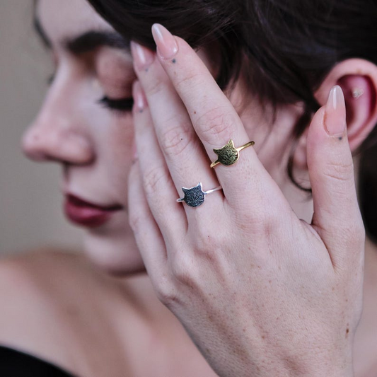 Handcrafted Sterling Silver Cat Ring – Cute Open Adjustable Cat Lover Gift with Gem Eyes